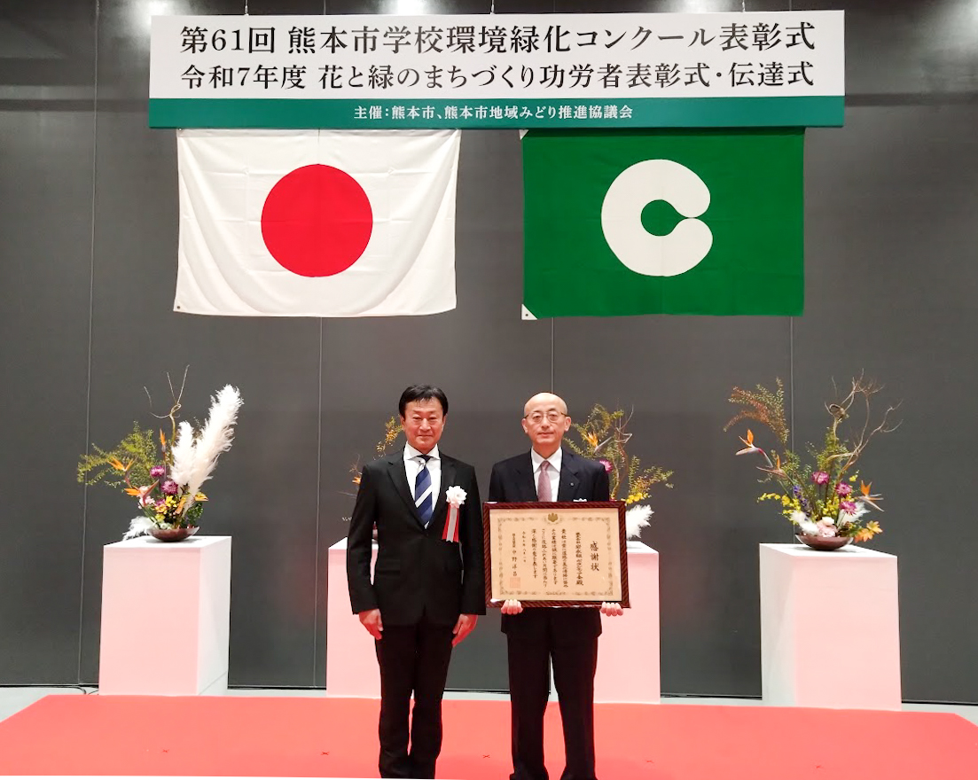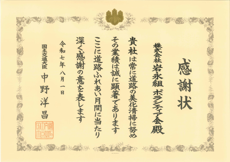 11月16日(日)熊本城ホールにて 令和7年度花とみどりのまちづくり功労者表彰式において、弊社 株式会社岩永組ボランティア会が「道路ふれあい月間」国土交通大臣表彰 を受賞し感謝状と記念の盾を頂きました。