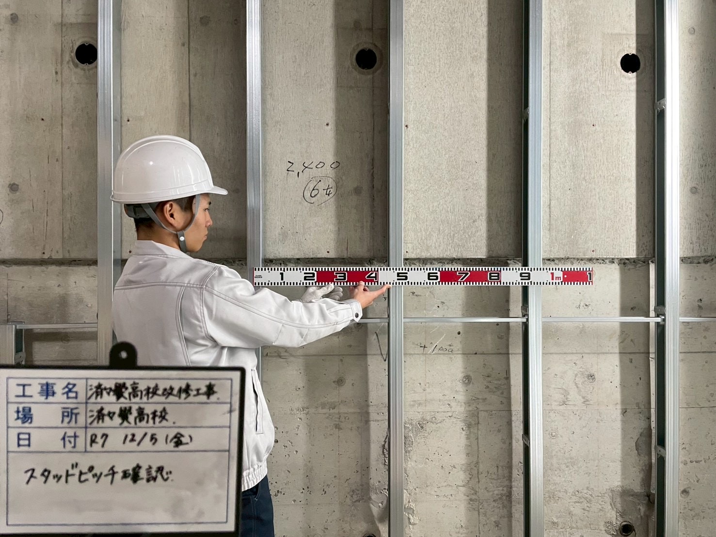 熊本工業高校建築科の森下さんと福岡さんは、岩永・竹内建設工事共同企業体で施工中の「済々黌高校長寿命化改修(第二期)工事」の現場へ行ってもらいました。