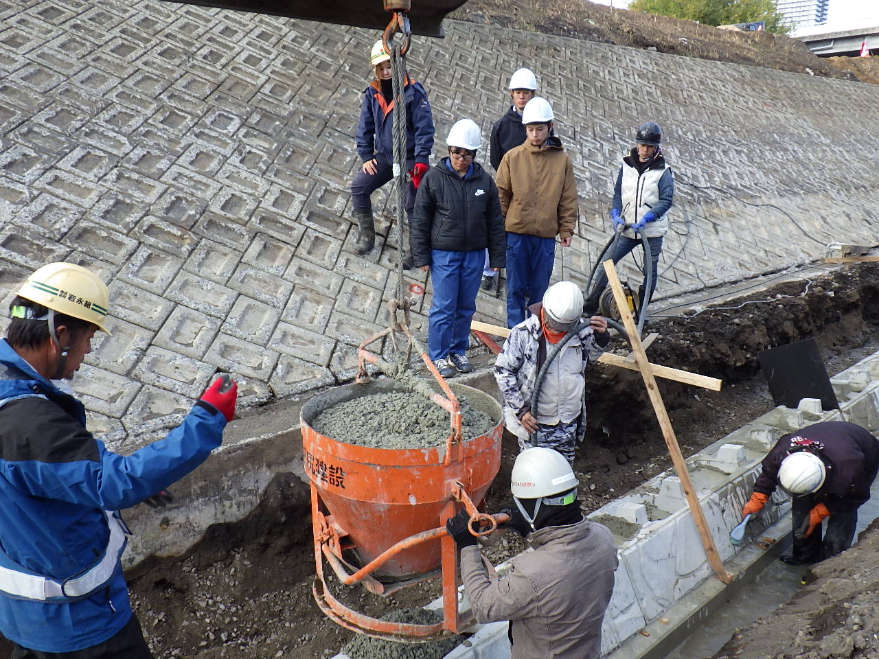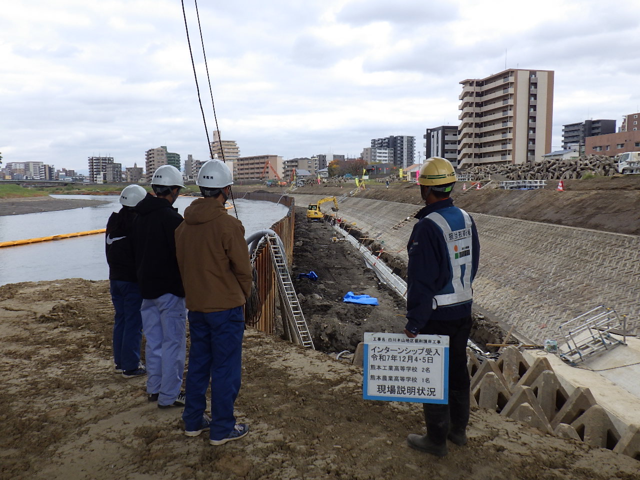 熊本工業土木科の吉村さんと山口さん、熊本農業高校農業土木科の木下さんは、「白川本山地区掘削護岸工事」の現場と、その他現在施工中の現場へ行ってもらいました。