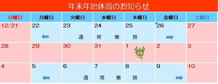 12月27日(土)から年明け1月4日(日)まで休暇とさせて頂きます。