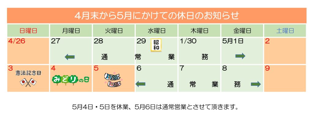 4月末から5月にかけての連休のお知らせ!