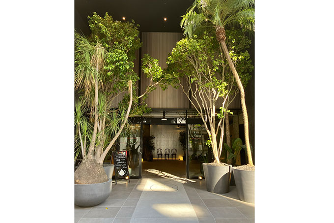 外観は、内装と同じく黒を基調としており、エントランスの床にはTAUの文字が入ったサインを埋め込み、上部には小倉織と呼ばれる歴史ある織物がデザインされ新たなホテルの玄関となりました。